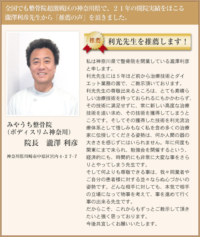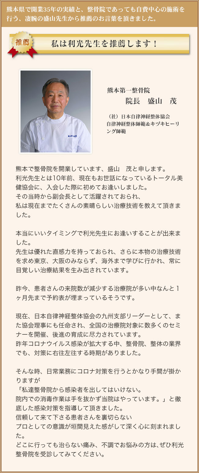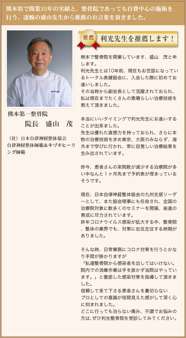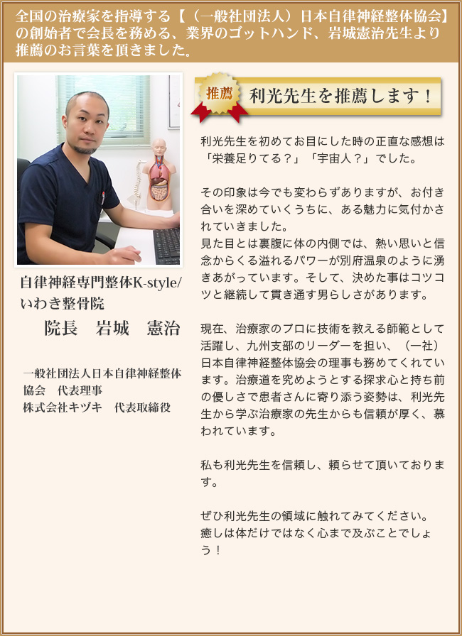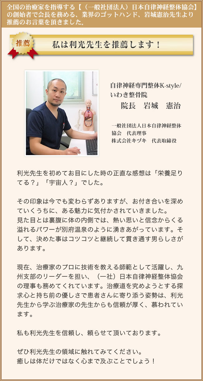 無理な姿勢での作業で腰を痛めてしまい、その痛みで寝られませんでした。翌日、利光先生を知人から紹介していただき電話をしました。先生にスケジュール調整をしてもらい、幸いにもその日に施術していただけました。お陰様で痛みも軽減して、前日のような辛い夜を過ごさないで済むようになりました。とても感謝してます、ありがとうございます。