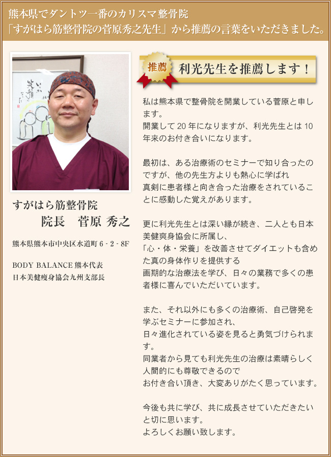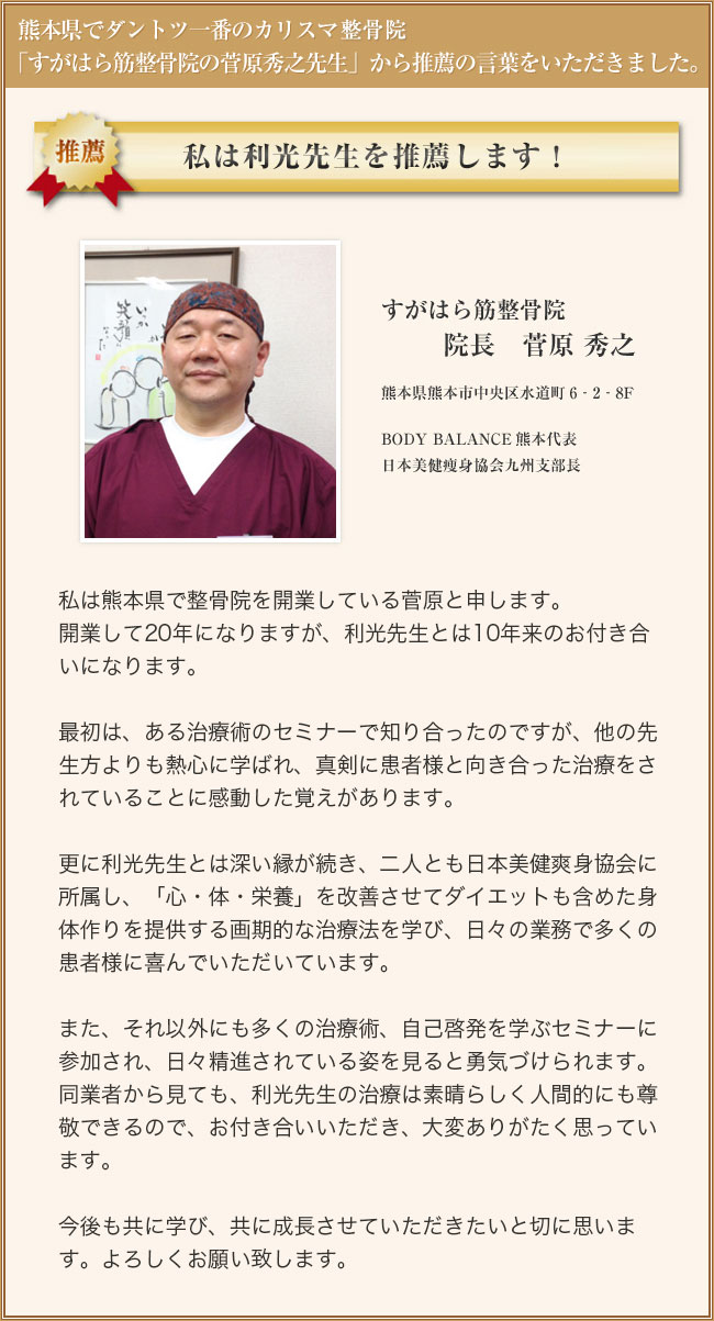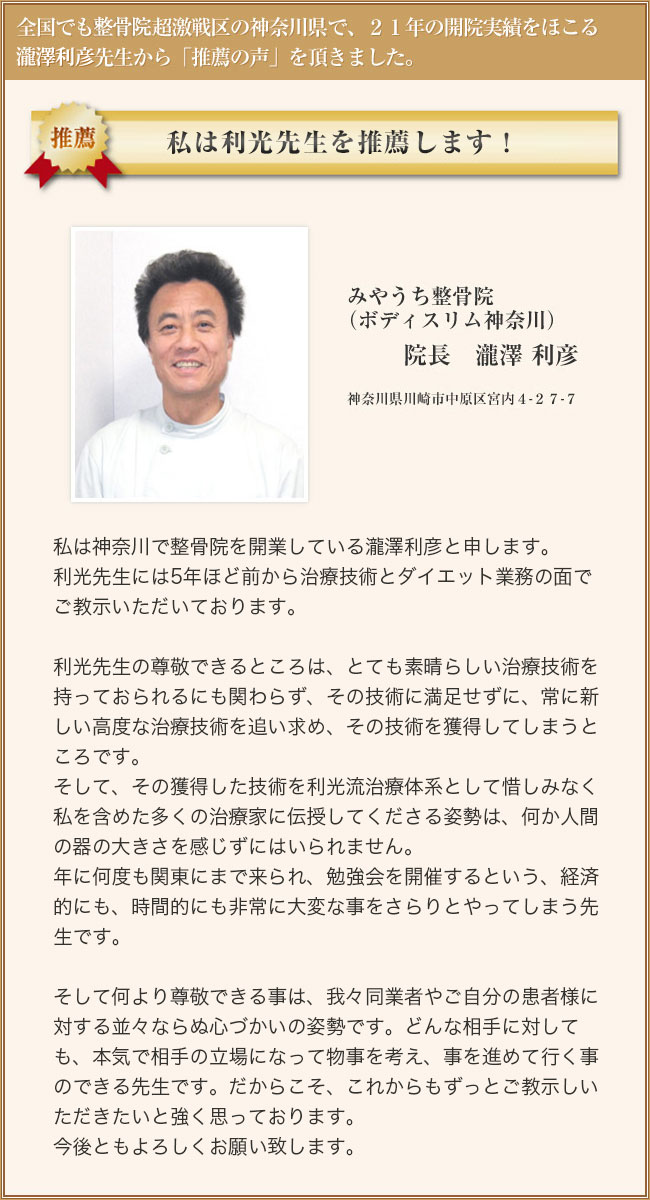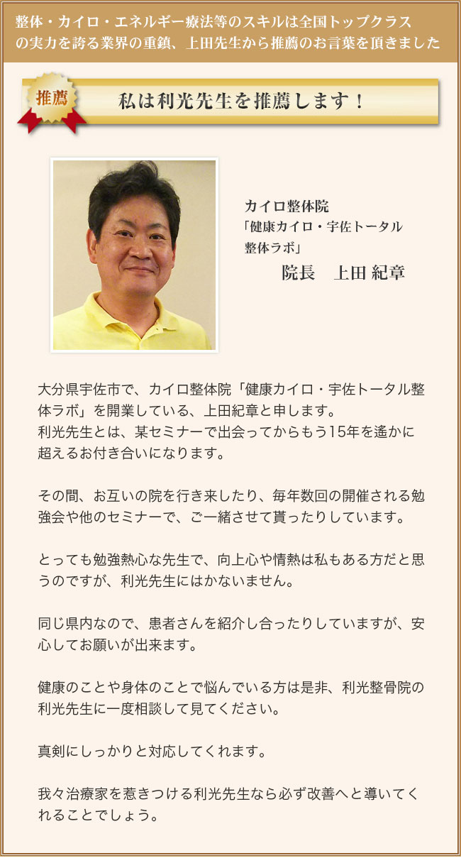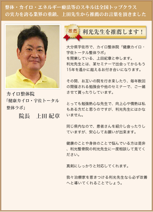 無理な姿勢での作業で腰を痛めてしまい、その痛みで寝られませんでした。翌日、利光先生を知人から紹介していただき電話をしました。先生にスケジュール調整をしてもらい、幸いにもその日に施術していただけました。お陰様で痛みも軽減して、前日のような辛い夜を過ごさないで済むようになりました。とても感謝してます、ありがとうございます。